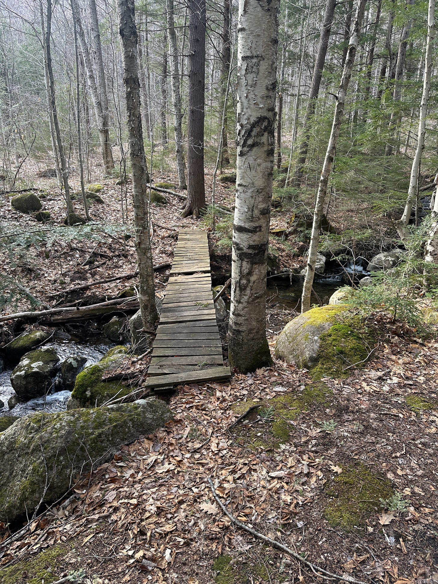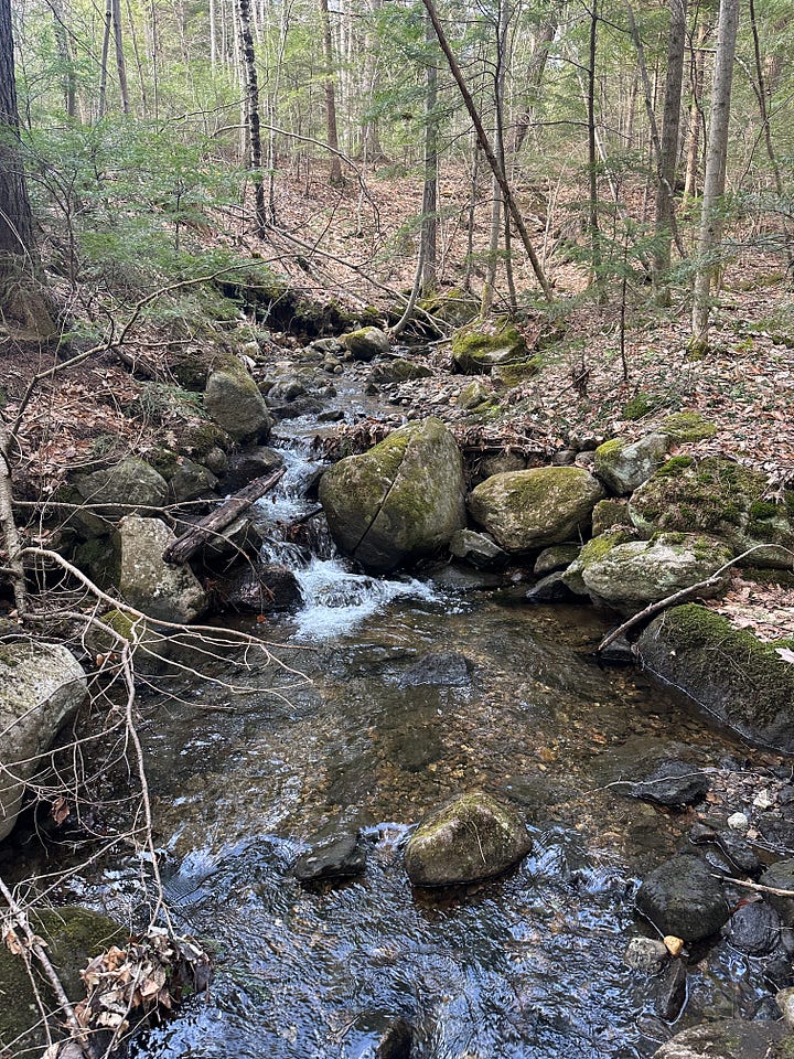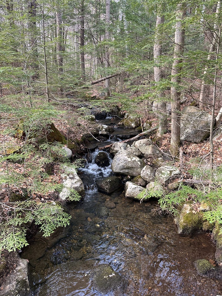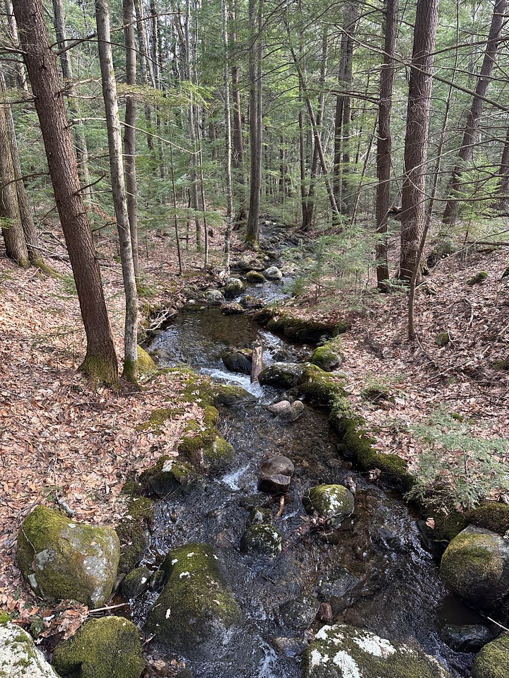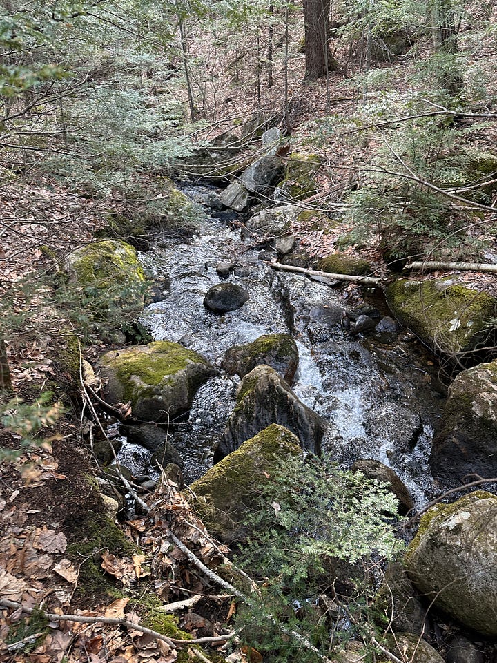Most of my motivation to jump in a brook was now gone, but fortunately (?) my stubbornness always persists. When we actually reached the intersection of the trail, I found that Gates Brook was, as expected, quite small, but still flowing enough to give me hope. There’s a footbridge here that crosses over the brook and leads on to the top of Middle Mountain. I had gone over it once before, when my mom and I hiked a loop over Middle Mountain from Mill Brook Road, returning by way of this trail and then up over Mt. Crag.