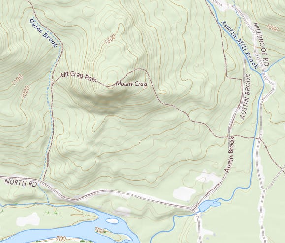 There are a few options for accessing Mt. Crag. There are two trailheads on the North Road at either end of the loop trail (which requires a short road walk to complete). Alternatively you can find a place to park on the dirt Mill Brook Road and then cross Austin Mill Brook (which is considerably larger than today’s target brook) in one of two places, one of which features a unique cable car.