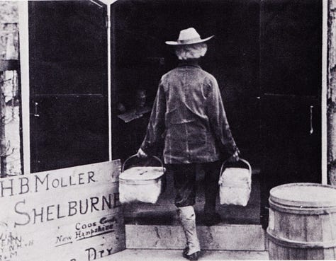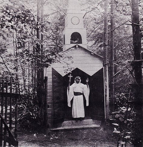 This is H. B. Moller and his mother Mrs. Moller. Their little settlement in Shelburne, N.H. was talked about for years. In the woods and blocked by a fence for privacy. From 1901-1923 the Mollers spent their summers in Shelburne. H. B. Moller was in poor health and in need for something to do. Miss Sarah Gates who owned an Inn where the Mollers boarded told the Mollers that they could use any of the 200 acres at no charge. Off went H. B. to build his little village. H. B. built a small little church, Mother's private cabin, a cabin for H. B., dog houses, pigeon loft, general store, an open air restaurant, Grecian Temple of Music, [and] a tiny theater, 12 by 15 feet, which even had a ticket window. H. B. seems to be doing fine from what we can see in the photos.